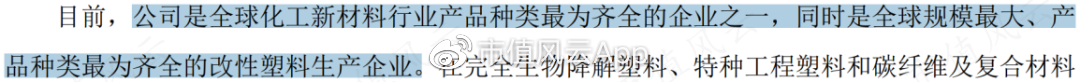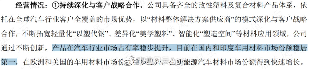 再以车用材料业务为例,凭借齐全的改性塑料及复合材料产品体系以及依托于全球汽车行业客户全覆盖的市场优势,公司目前在国内和印度车用材料市场份额稳居第一。