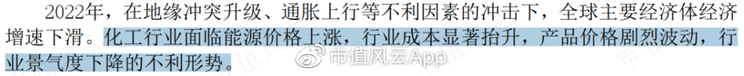 作为行业内的标杆企业,万华化学(600309.SH)对于行业大势的判断值得重视。而对于2022年及2023年一季度的行业形势,万华化学概括为“化工行业能源价格上涨,行业成本显著抬升,产品价格剧烈波动,行业景气度下降”。