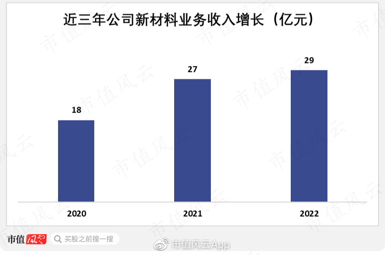 近三年,公司新材料业务收入增长可观,由2020年的18亿元增至2022年的29亿元,CAGR为27%。2022年新材料业务收入占公司总收入的比重为7%,较2020年提高了2个百分点。
