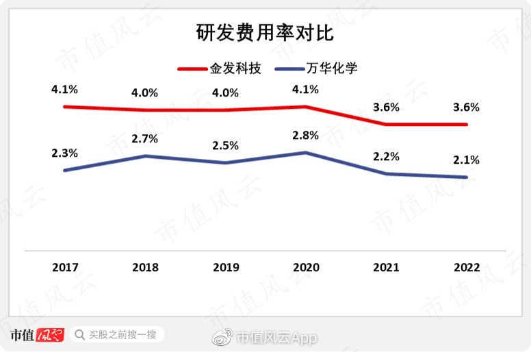 与万华化学对比来看,公司的研发费用率持续高出一筹,2022年公司的研发费用率为3.6%,较万华化学2.1%的研发费用率高出1.5个百分点。
