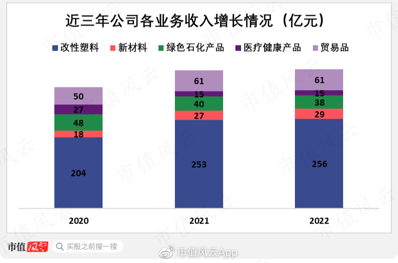 在绿色石化产品、医疗健康产品以及贸易品收入规模出现回落后,新材料业务迎头赶上,成为近三年公司增长最快的业务板块。