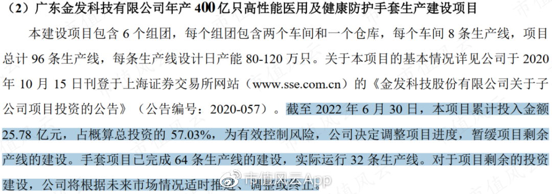 该项目主要生产医用手套,截至2022年6月末,已建成64条生产线,实际运行32条。联系到疫情防控已经告一段落,与之相对应的资产减值也在情理之中。