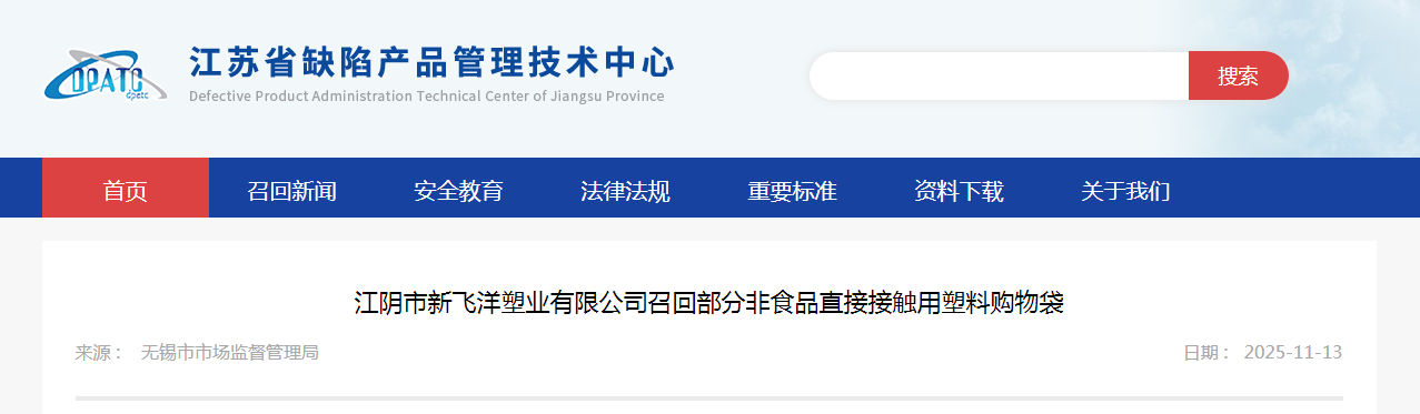中国质量新闻网讯 据江苏省缺陷产品管理技术中心网站消息,日前,江阴市新飞洋塑业有限公司按照《消费品召回管理暂行规定》《江苏省缺陷消费品召回管理办法》的要求,向无锡市市场监督管理局报告了召回计划,将自即日起,召回2024年9月3日至2025年10月22日期间制造的非食品直接接触用塑料购物袋,共涉及数量为65300包(10只/包),具体如下:1、640*(450+150)*0.030mm型,涉及数量为12750包(10只/包);2、600*(350+140)*0.030mm型,涉及数量为39700包(10只/包);3、500*(300+120)*0.030mm,涉及数量为12850包(10只/包)。
