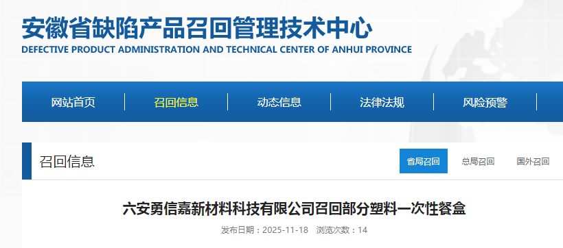 中国质量新闻网讯 据安徽省缺陷产品召回管理技术中心网站消息,日前,六安勇信嘉新材料科技有限公司按照《消费品召回管理暂行规定》的要求,向安徽省市场监督管理局、六安市市场监督管理局报告了召回计划,自即日起,将召回2025年5月29日至6月6日生产的塑料一次性餐盒,分别为200包(规格型号:小一浅 11丝/100个/包)、48包(规格型号:带扣小一深 11丝)、20包(规格型号:大一深 11丝)、90包(规格型号:中一深 11丝)、40包(规格型号:带扣长条盒 11丝)、40包(规格型号:小一深 11丝),涉及数量总计为438包(100个/包)。