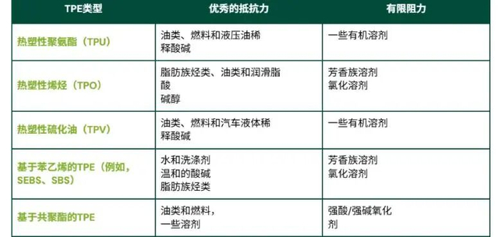 热塑性弹性体的耐化学性主要取决于多种因素。首先,它依赖于基础聚合物;其次,取决于交联的程度和类型。通常,具有更多极性和饱和聚合物主链的TPE能更好地抵抗非极性化学品。温度、化学品浓度和暴露时间也会影响TPE的耐化学性。以下列出了对各种化学品表现出优异或有限耐受性的弹性体亚类。
