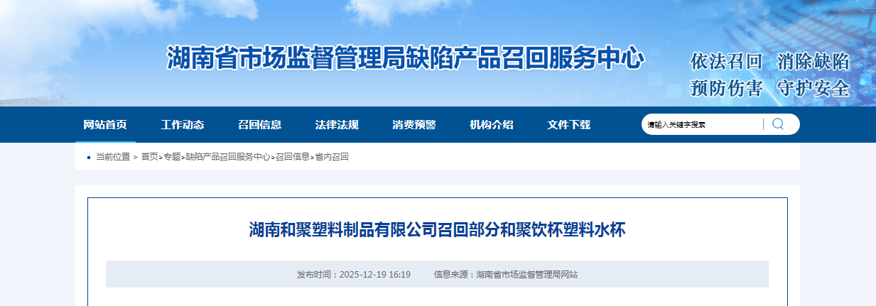 中国质量新闻网讯 据湖南省市场监督管理局缺陷产品召回服务中心网站消息,日前,湖南和聚塑料制品有限公司按照《消费品召回管理暂行规定》的要求,主动向湖南省市场监督管理局报告了召回计划,将自即日起,召回2024年1月1日生产的和聚饮杯塑料水杯,规格为220mL/只、100只/包,涉及数量为400包。