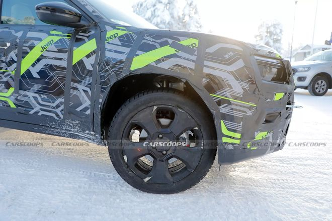 外观方面,路试车辆采用了带有 Jeep 品牌图形的全车伪装,透过伪装缝隙观察,分体式 LED 前大灯和散热进气口的位置与现款保持一致。